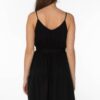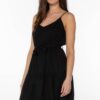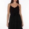 A soft and lightweight tiered dress made from Tencel?. This black dress features a v-neck, a self-belt, adjustable spaghetti straps, and a flowy tiered skirt.