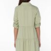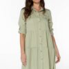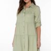 A lightweight and flowy babydoll dress. This dress features basic collar, button-up at the front, roll-tab sleeves, front flap pockets, flowy tiered details, and knee-length hem.