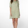 A lightweight and flowy babydoll dress. This dress features basic collar, button-up at the front, roll-tab sleeves, front flap pockets, flowy tiered details, and knee-length hem.